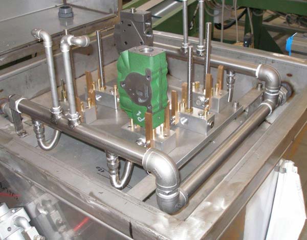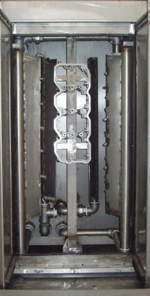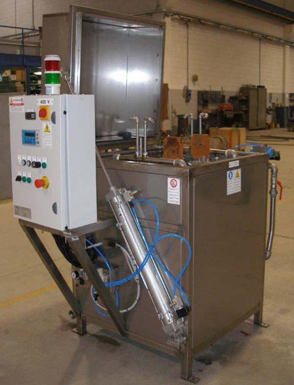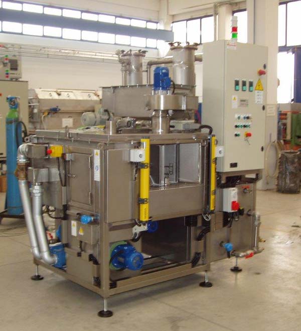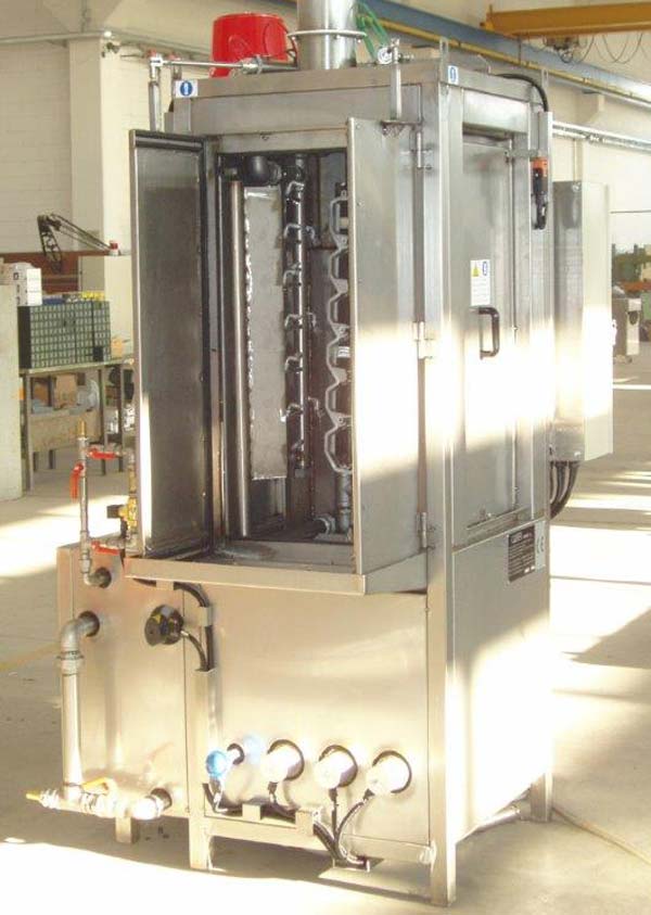 Após o carregamento da peça, por meio de robô , a tampa superior é fechada e começa o ciclo de tratamento. Quando o ciclo termina a tampa abre e o robô é responsável pela descarga e carga subsequente. Modelo usado para distribuidores hidráulicos ferro fundido após trabalho mecânico.